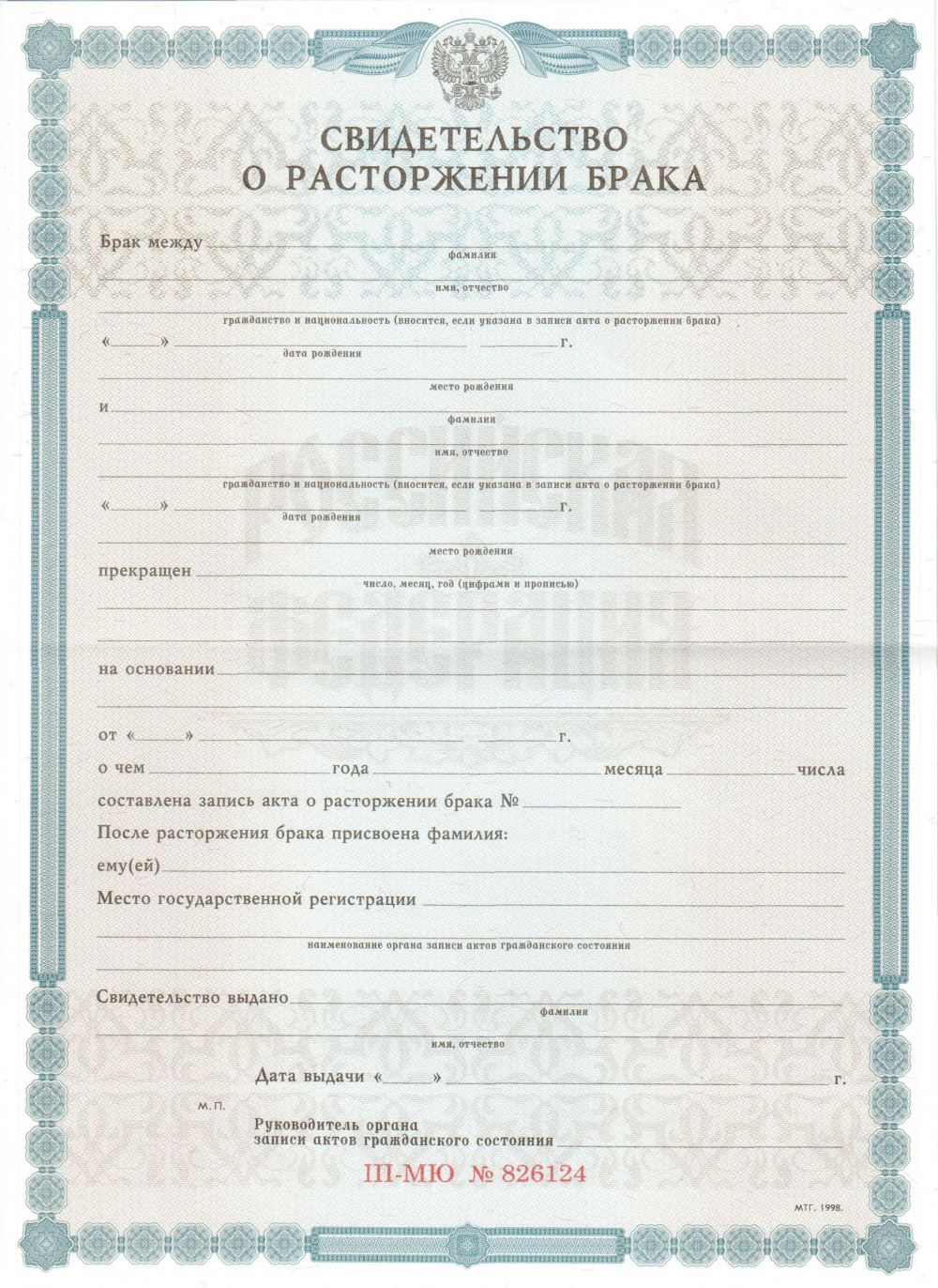 Свидетельство о расторжении брака РФ 1998-2025
